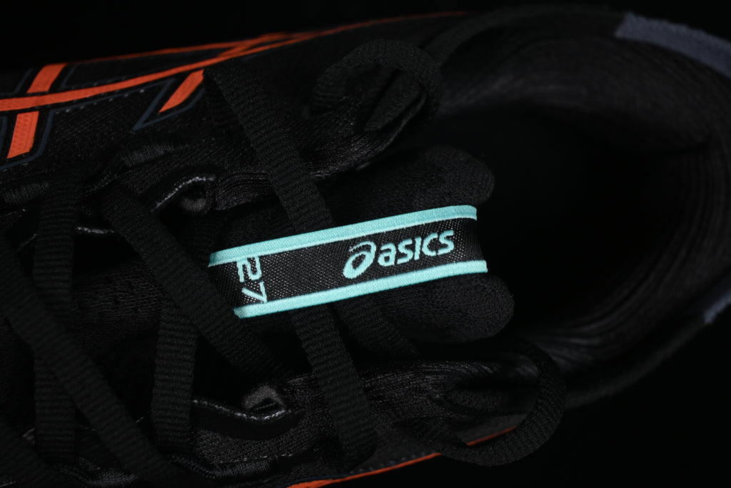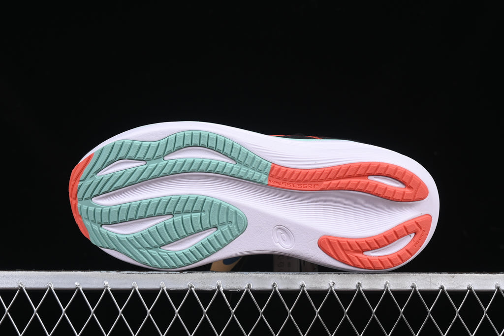 O visual entrega sofisticação esportiva: preto dominante no cabedal, contrastando com detalhes em coral nas faixas ASICS e verde água/mint na entressola. Um design limpo, moderno e técnico, que comunica performance sem exageros.