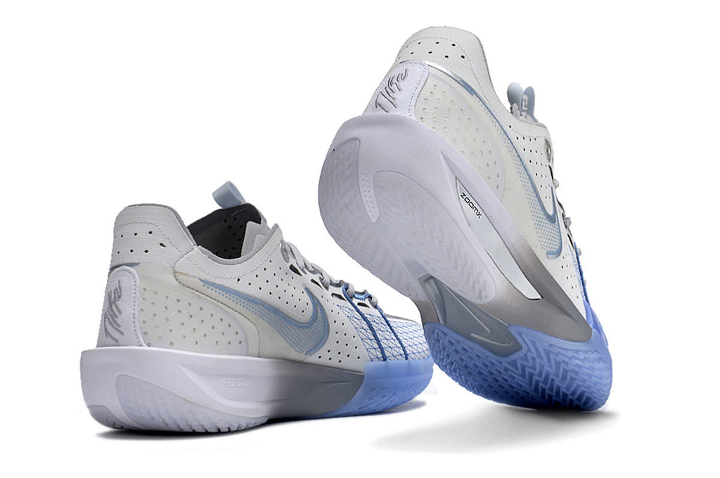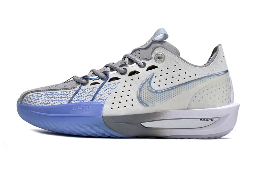A colorway Wolf Grey trabalha tons de cinza claro com acentos em azul gelo no antepé e na sola, criando um visual técnico, moderno e sofisticado. É um design limpo, funcional e com identidade de performance — discreto na estética, agressivo na execução.