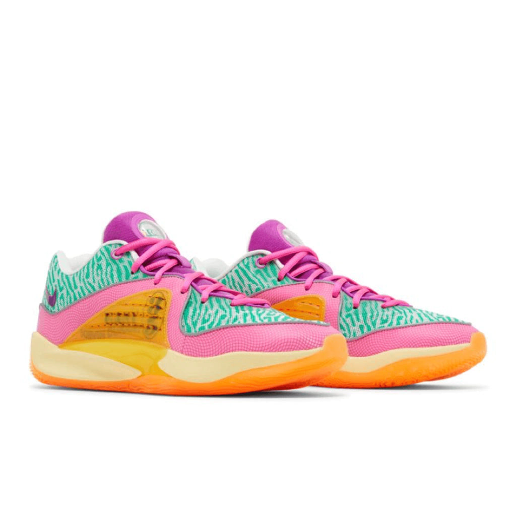 - Design vibrante: O tênis apresenta uma paleta de cores ousada, incluindo verde estádio, hiper violeta (magenta), rosa divertido e laranja, que presta homenagem ao apelido "Easy Money" de Kevin Durant, fazendo referência às cores de moedas globais. As listras verdes na parte superior de malha dão um visual único de estampa de tigre.