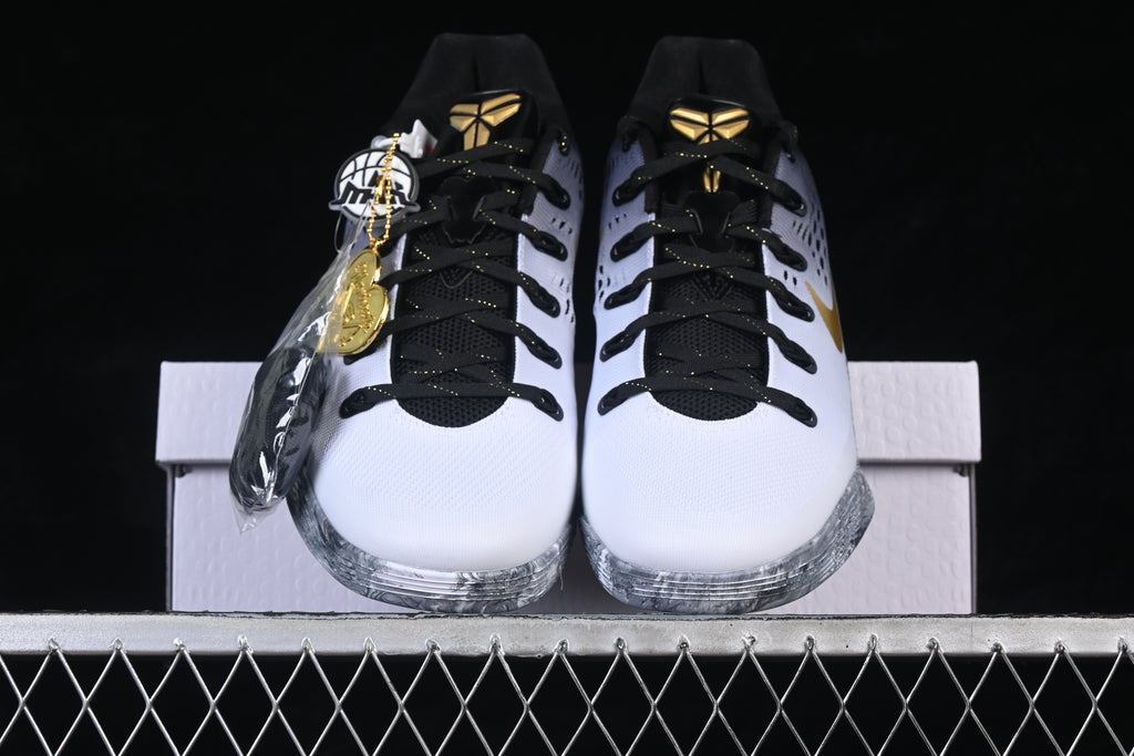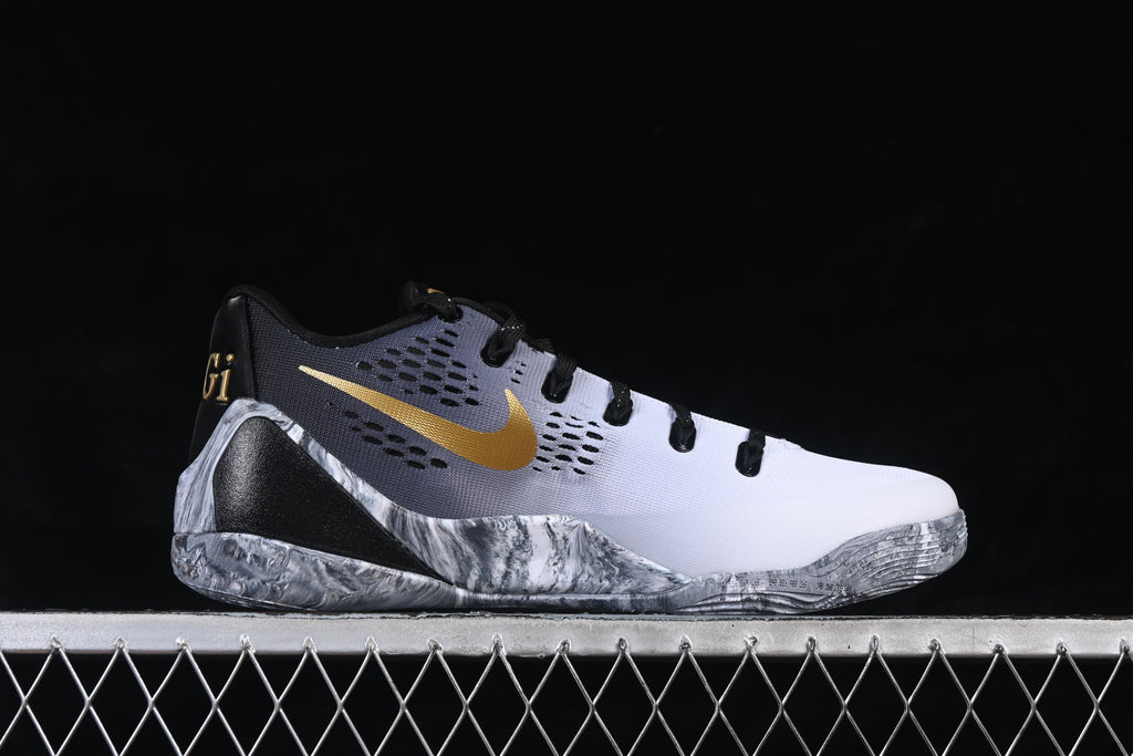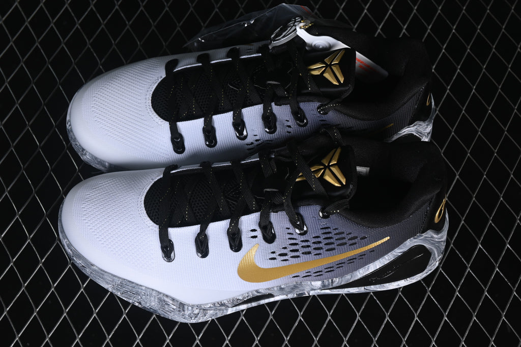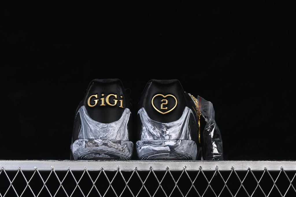 O cabedal em engineered mesh apresenta um degradê do branco ao preto, representando a dualidade entre leveza e intensidade, começo e evolução. Os detalhes em dourado metálico elevam o conjunto com sofisticação: Swoosh dourado, bordado “Gigi” e o coração com o número 2 no calcanhar, referência direta à camisa de Gigi.