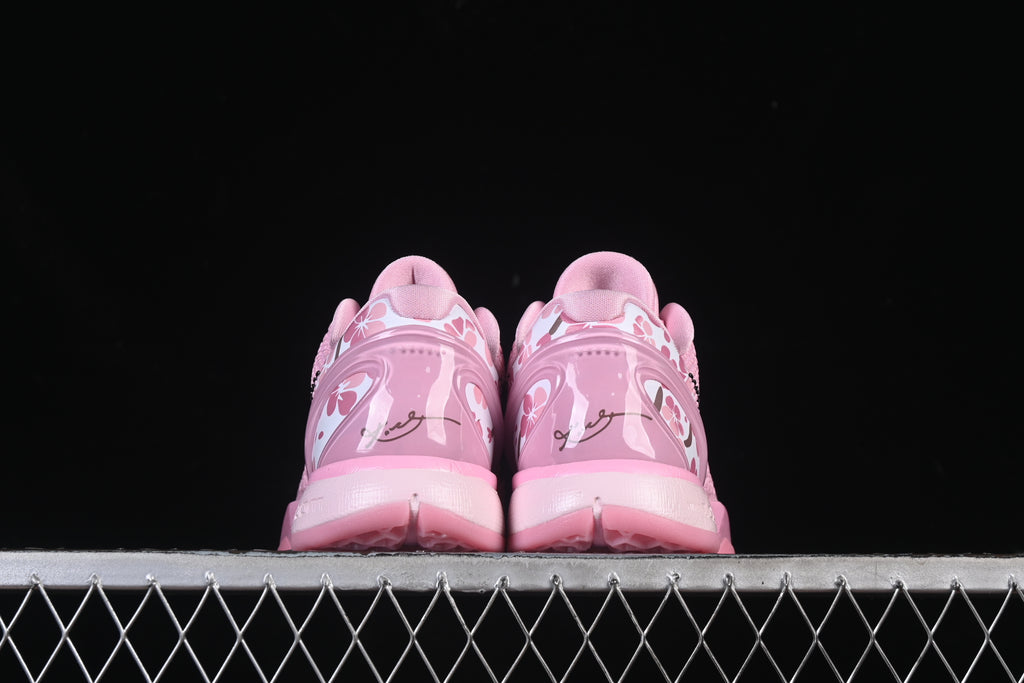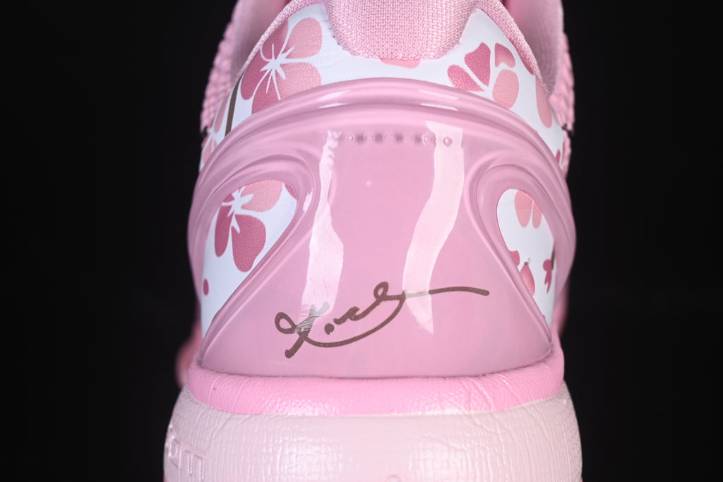 O cabedal com textura inspirada em escamas mantém o DNA clássico do Kobe 6, garantindo ajuste firme e estrutura para movimentos rápidos. A tonalidade rosa suave domina o modelo, enquanto o Swoosh preto cria contraste forte e direciona o olhar. No calcanhar, os detalhes florais reforçam a identidade Sakura, adicionando profundidade estética sem comprometer a performance.
