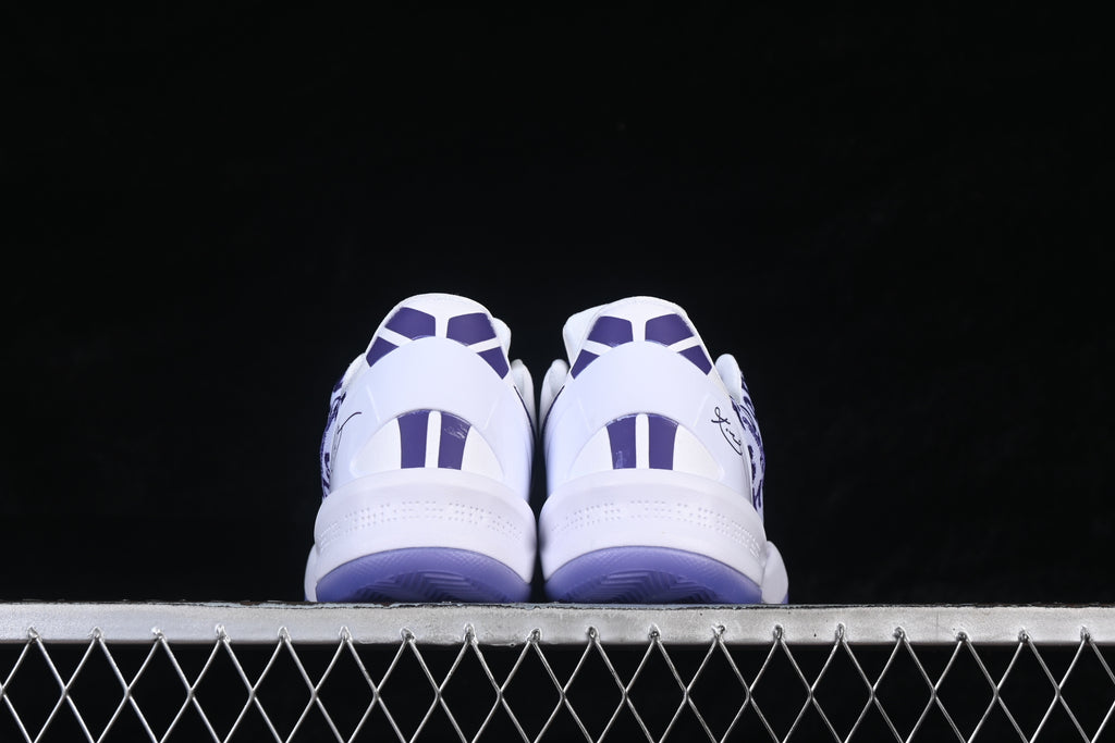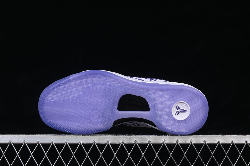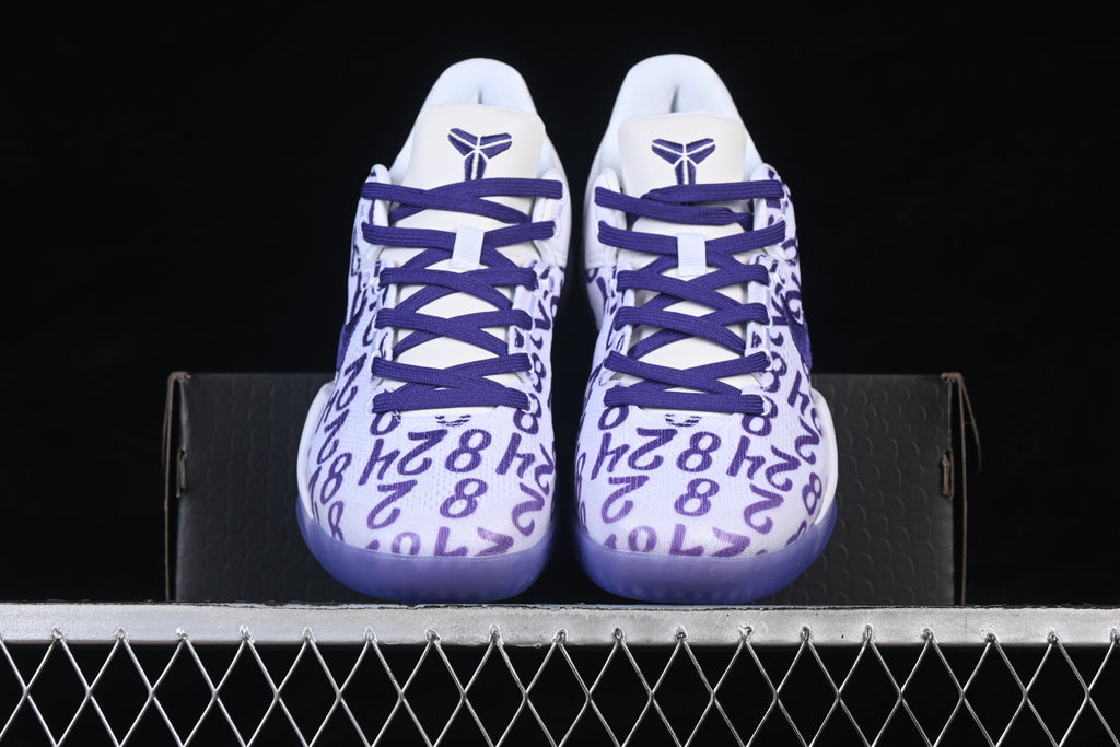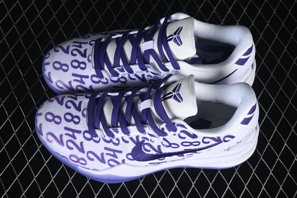 O cabedal em mesh branco recebe um padrão repetido com os números 8 e 24 em Court Purple, representando as duas fases mais marcantes da carreira de Kobe: o início explosivo e a maturidade dominante. O contraste é limpo, icônico e imediatamente reconhecível para quem entende o significado por trás do design.