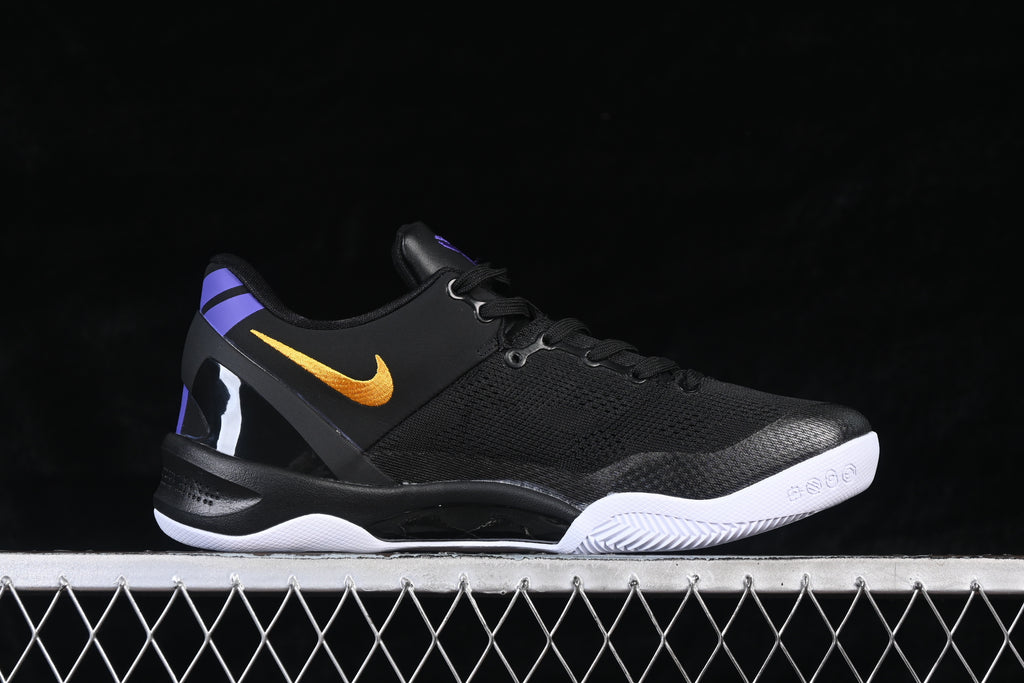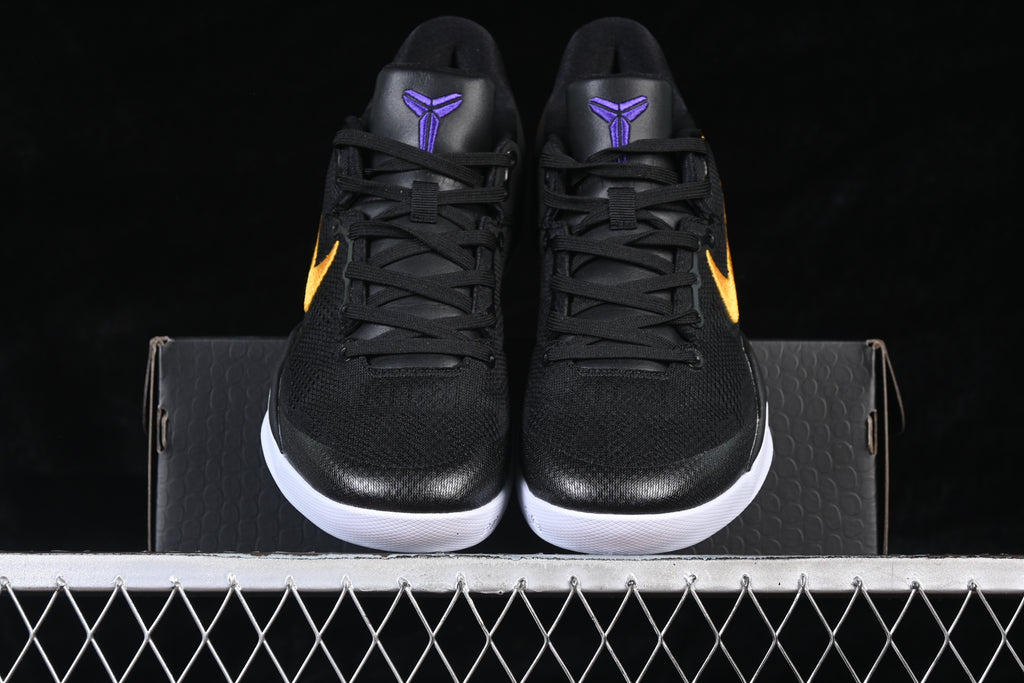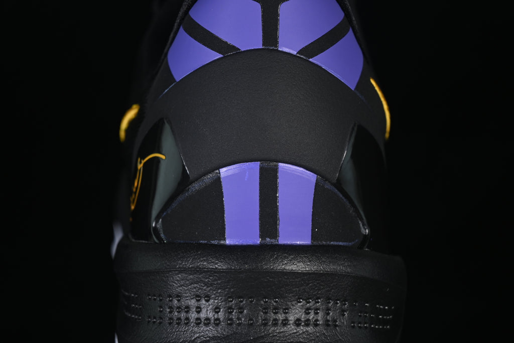 Os detalhes em dourado elevam o visual com assinatura clássica: Swoosh Nike bordado e a assinatura de Kobe Bryant no heel clip preto, reforçando a conexão direta com a identidade Lakers. A entressola preta mantém a proposta agressiva do modelo, enquanto o solado branco adiciona contraste e estabilidade ao conjunto.