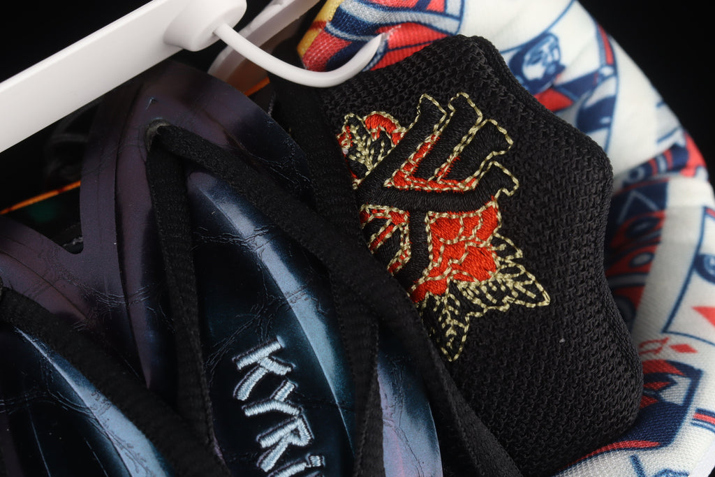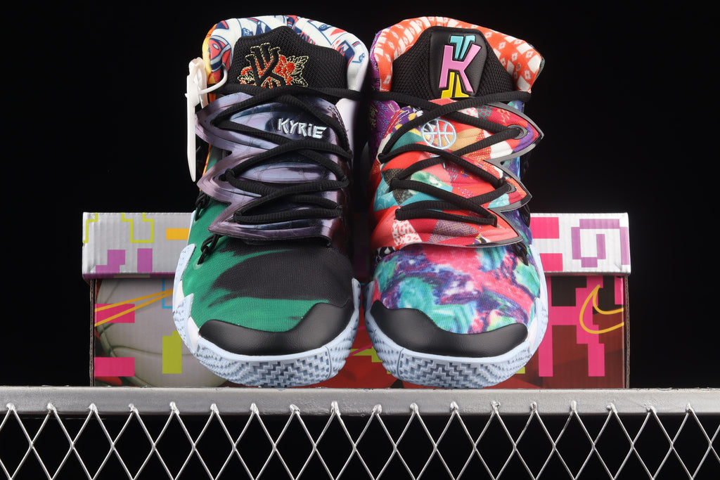 O visual abraça o conceito What The em sua forma mais ousada. Estampas multicoloridas, contrastes intensos e referências icônicas se encontram em um design propositalmente caótico. Elementos que remetem a colaborações marcantes da linha Kyrie aparecem de forma fragmentada, criando identidade forte e personalidade única. Nada é discreto. Tudo comunica movimento, energia e criatividade.