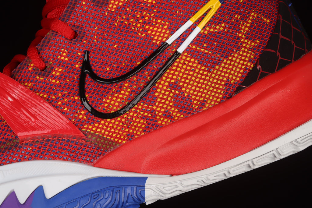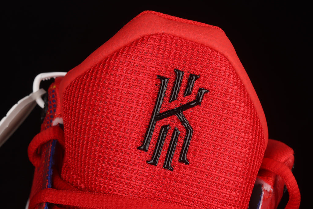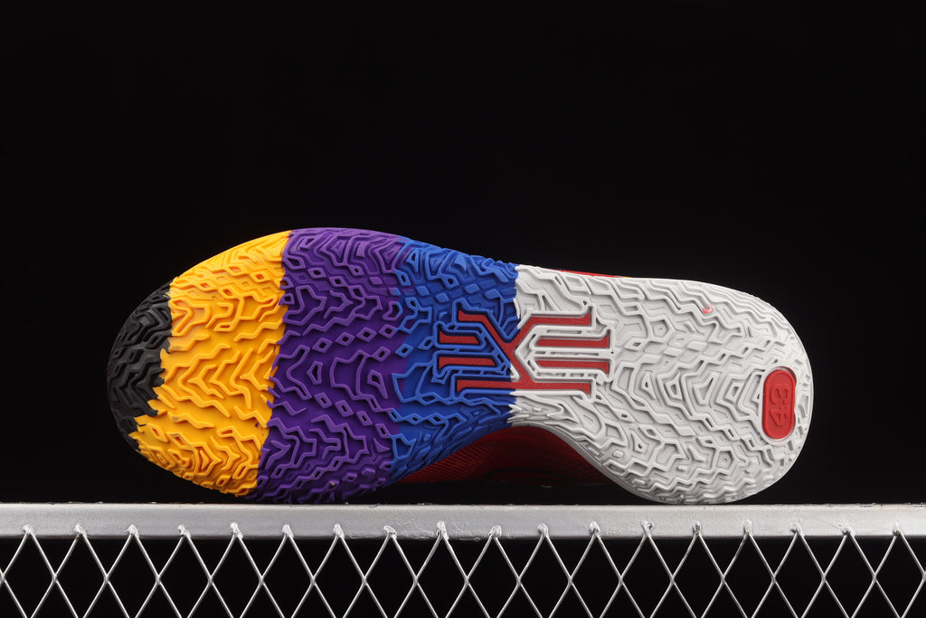 O cabedal em mesh técnico vermelho intenso entrega respirabilidade e leveza, enquanto a base gráfica multicolorida cria profundidade visual e homenageia ícones que moldaram a trajetória de Kyrie. Os detalhes em roxo e dourado fazem alusão direta ao legado de Kobe Bryant, enquanto os acentos em azul conectam o modelo à fase universitária de Kyrie sob a mentoria do Coach K. É narrativa bem amarrada, do conceito ao produto final.