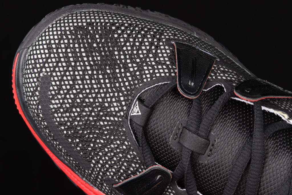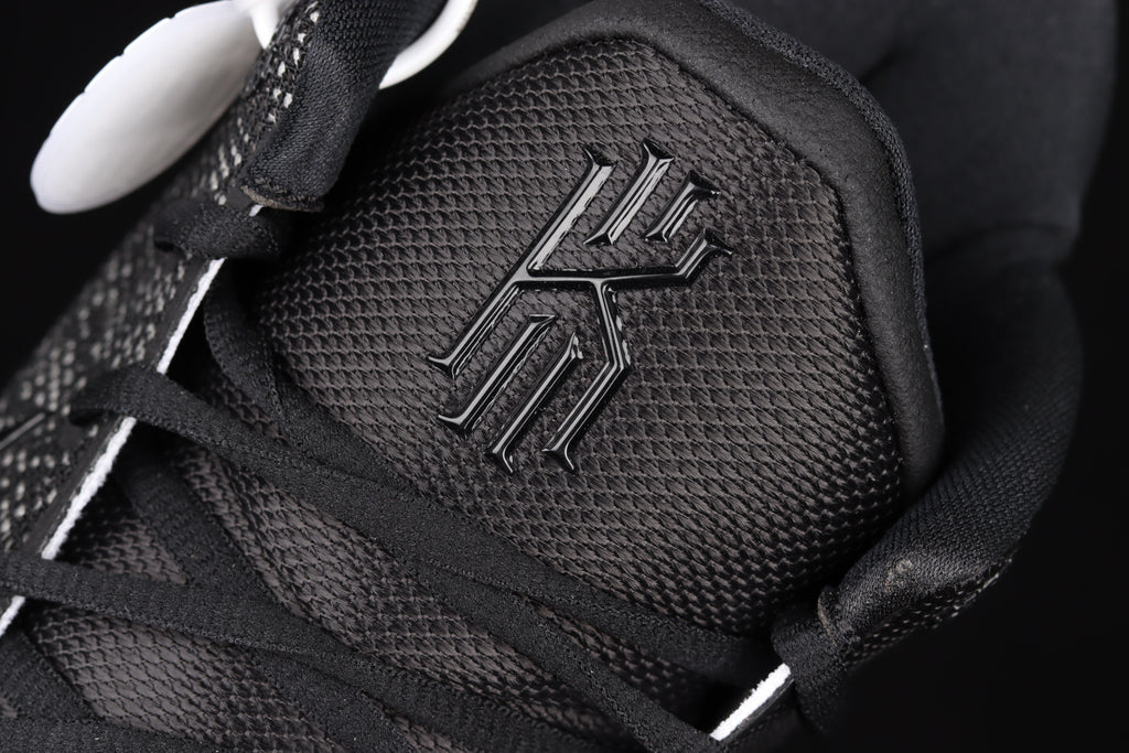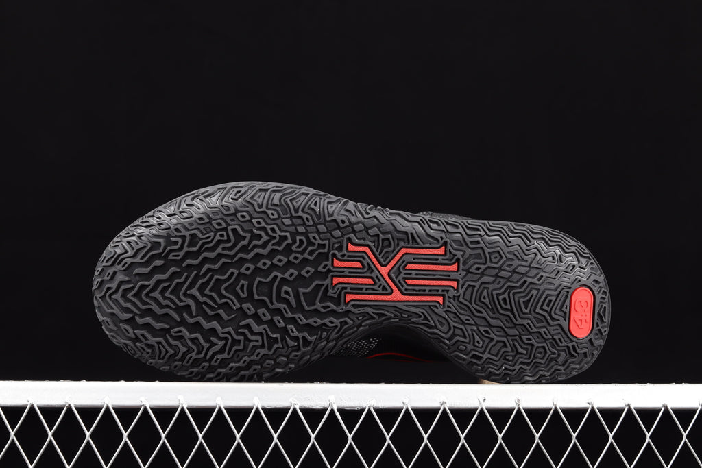 O cabedal em mesh preto entrega leveza e respirabilidade com estrutura suficiente para cortes agressivos. Os detalhes em vermelho na entressola criam contraste visual forte e reforçam a sensação de velocidade e impacto. O Swoosh contornado e a assinatura de Kyrie no calcanhar fecham o design com identidade limpa e reconhecível.