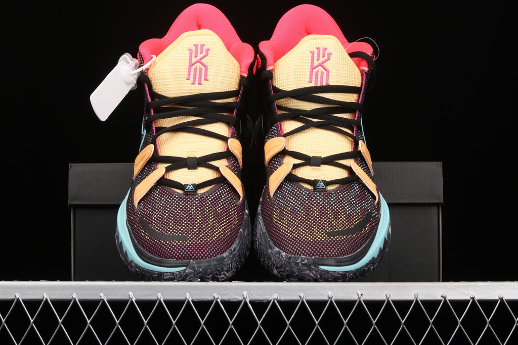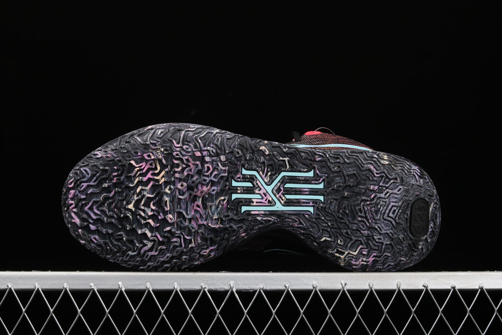 Detalhes como símbolos musicais, referências gráficas internas e o visual vibrante do solado conectam estética e desempenho, criando um Kyrie que joga no próprio compasso.
