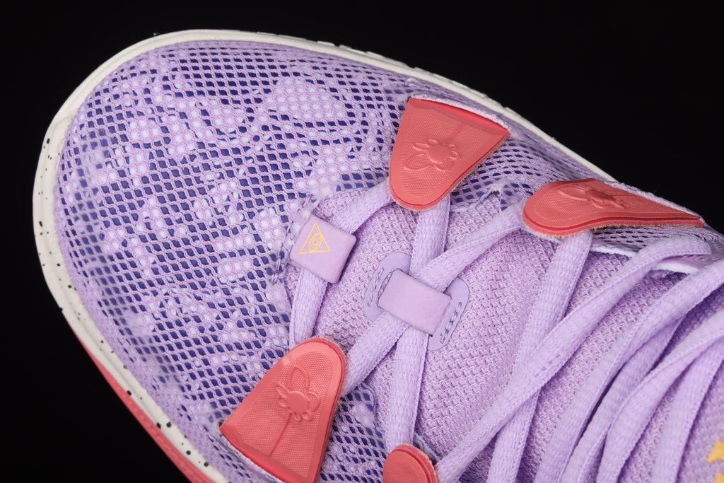 O cabedal em mesh lavanda garante leveza e respirabilidade, enquanto o padrão floral sutil aplicado na base têxtil adiciona profundidade visual e significado emocional. Os detalhes em coral nas estruturas de TPU integradas aos cadarços não são apenas estéticos: elas funcionam como aletas de contenção, oferecendo ajuste firme e lockdown preciso para movimentos rápidos e imprevisíveis.