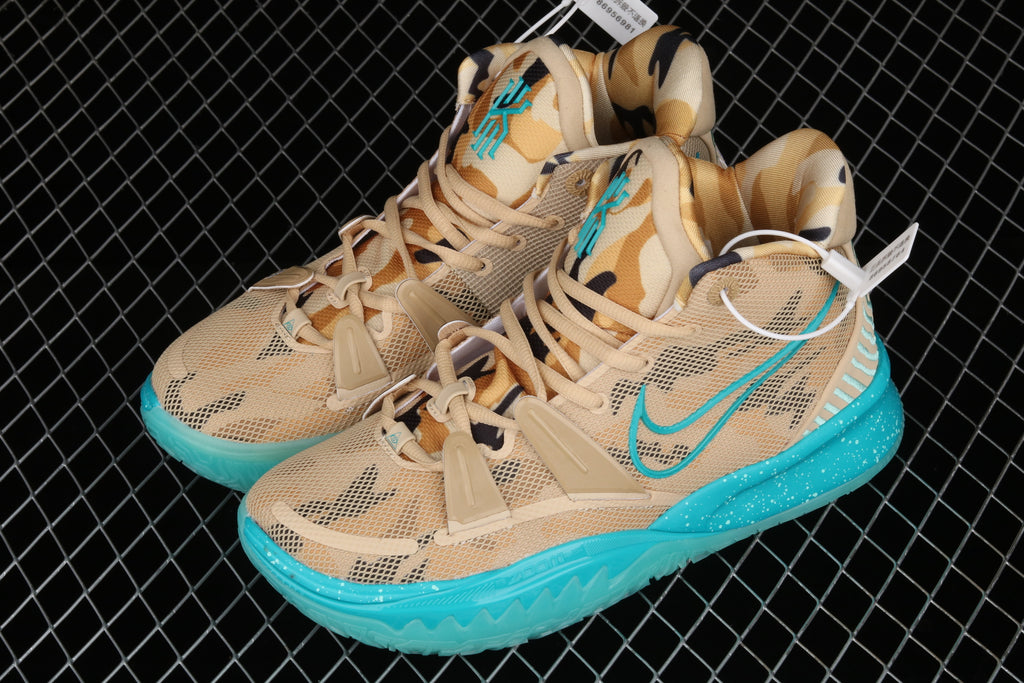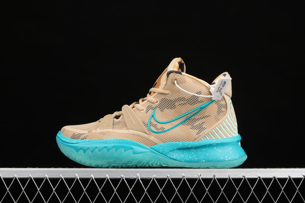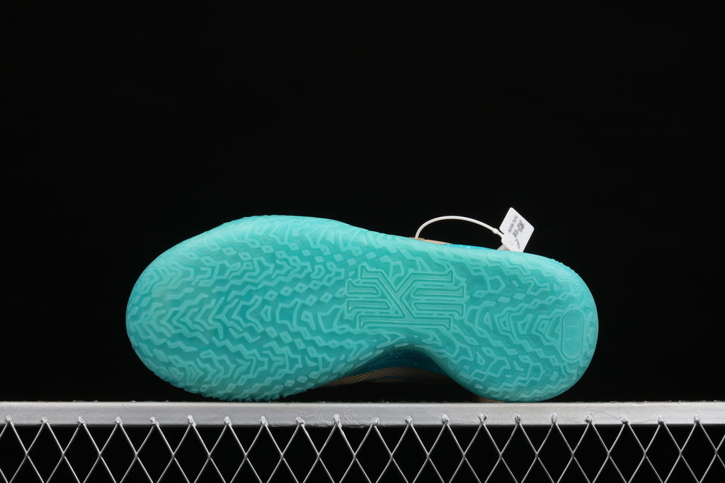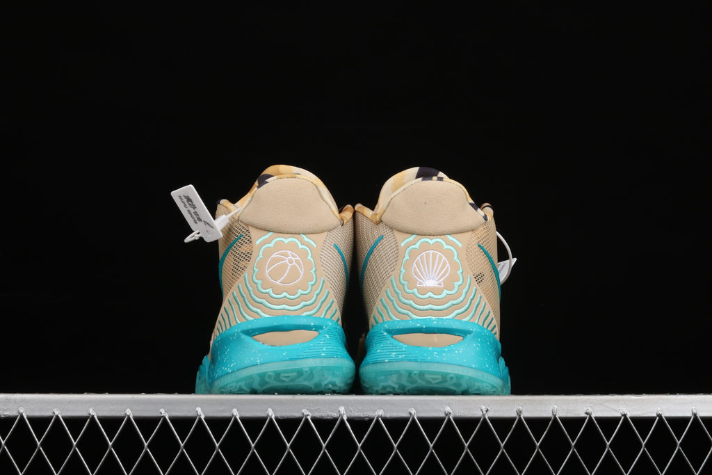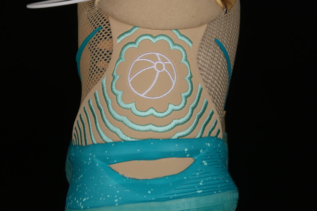 O cabedal em mesh leve na tonalidade areia cria uma base neutra e sofisticada, contrastando com a entressola em azul claro com efeito salpicado, que reforça a ideia de ondas em movimento. O Swoosh em azul pastel adiciona identidade visual marcante sem perder equilíbrio, enquanto os detalhes estruturais garantem suporte onde o jogo mais exige.