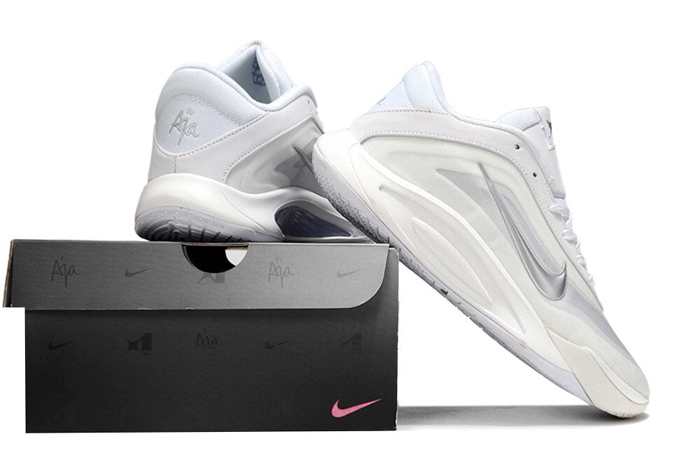 A colorway Ghost aposta em tons claros e perolados, com acabamento branco iridescente e detalhes prateados que remetem diretamente à história pessoal de A’ja Wilson. O visual é limpo, sofisticado e simbólico: leve na aparência, pesado na entrega dentro de quadra.