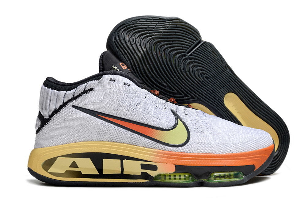 O visual entrega exatamente o que promete: base branca clean, contraste agressivo em Safety Orange e acentos em Volt, com o “AIR” oversized na entressola deixando claro o posicionamento do produto. É design funcional com presença forte — nada aqui é decorativo.